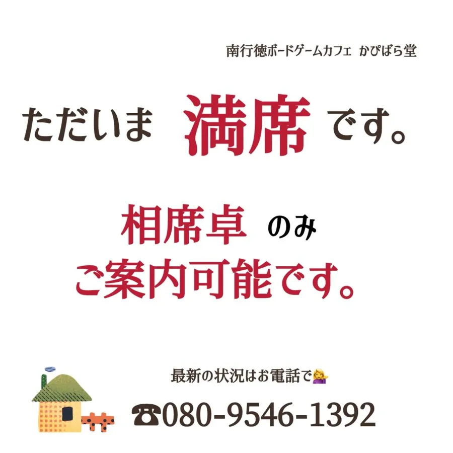 相席卓も残り少なくなっておりますので、ご来店前にお電話いただけますと、最新の店内状況をご案内いたします